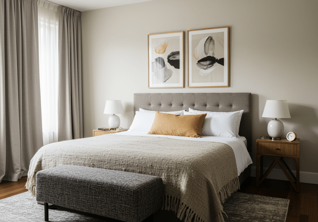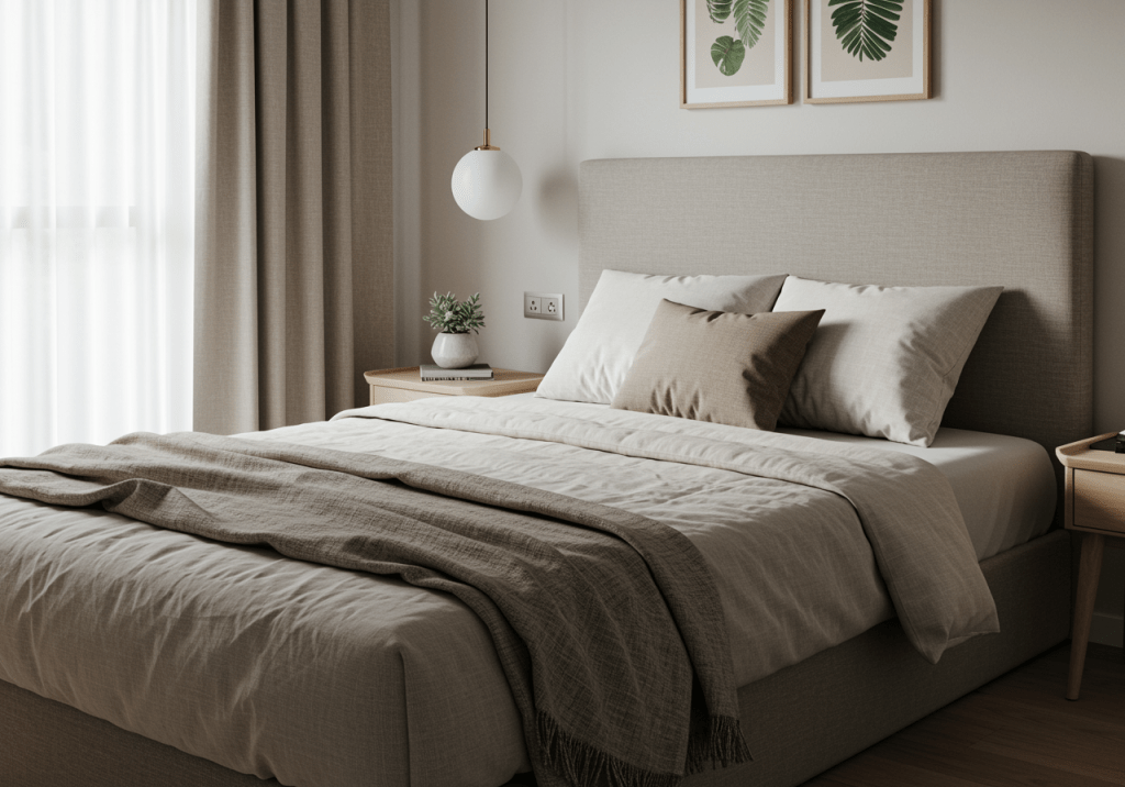 An upholstered headboard adds comfort and softness while remaining visually understated. Neutral fabrics keep the look timeless and adaptable. This is ideal for guest rooms where comfort matters as much as appearance.