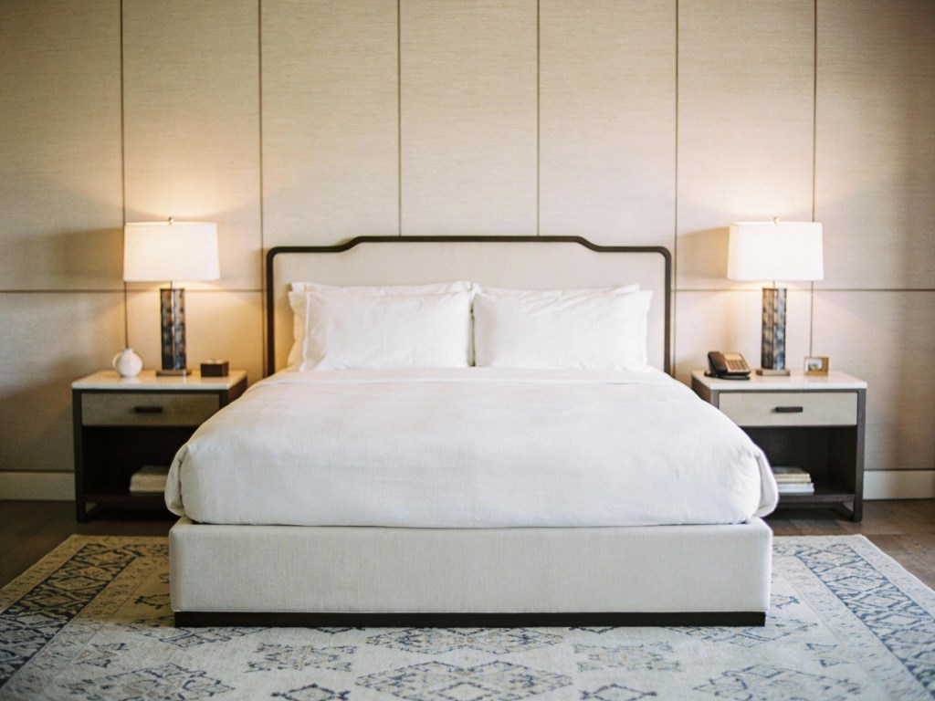 This approach works best in guest rooms where flexibility and broad appeal matter more than bold color statements.