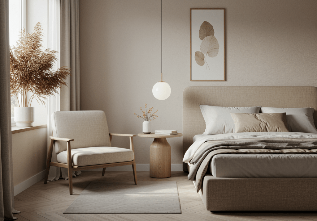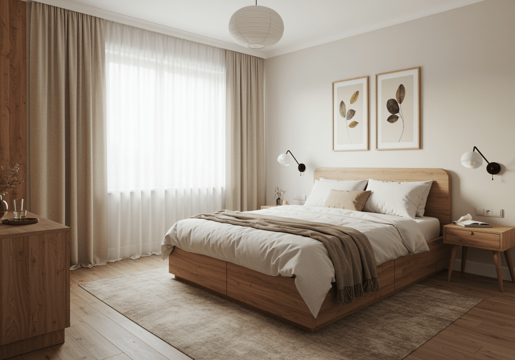 Light-filtering curtains or linen drapes support natural light while maintaining privacy. These materials keep the room feeling open rather than enclosed. Avoiding heavy fabrics helps preserve a modern, relaxed look.