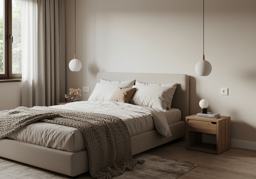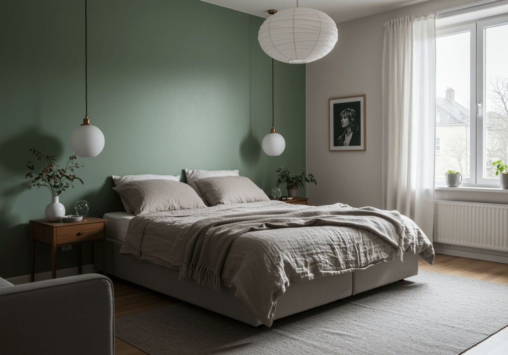 A muted accent wall introduces depth while preserving a quiet overall feel. Soft greens, warm grays, or subtle paneling add character without dominating the room. Placing the accent behind the bed keeps the design grounded.