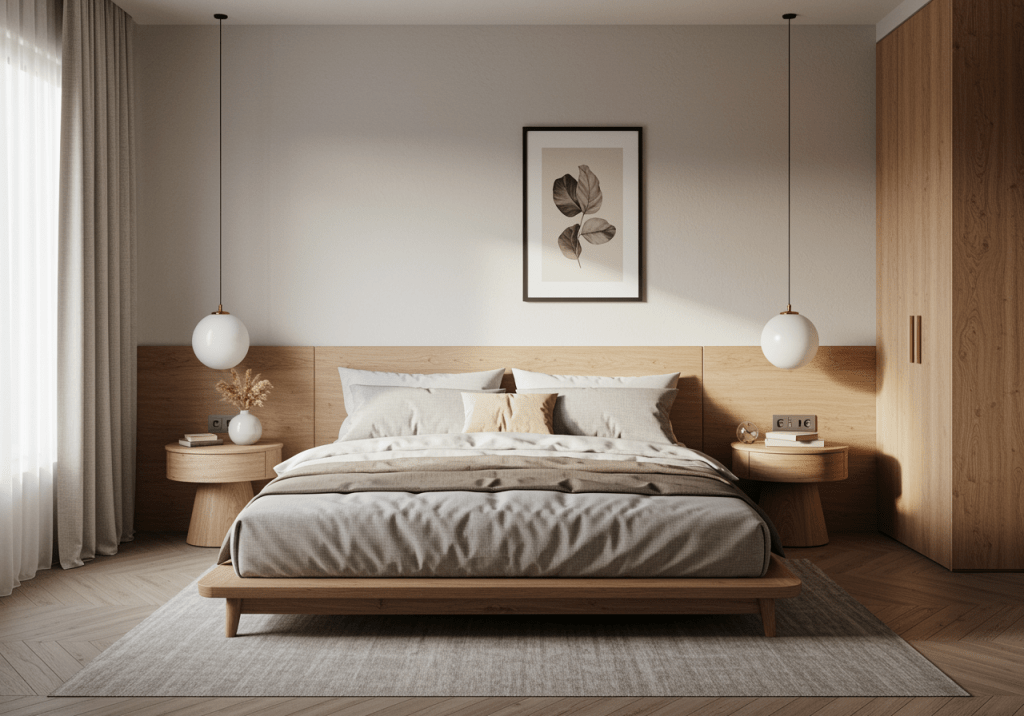 A wood bed frame with clean lines brings warmth into a modern space without feeling heavy. Natural finishes soften the overall look while still aligning with contemporary design principles. Low-profile frames help keep the room feeling open and balanced.